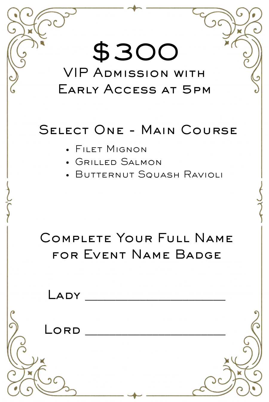 Your General Admission ticket includes a full evening of fine dining, dancing, live entertainment, and access to themed experiences, along with professional event photography packages available. Doors open at 5:45pm. Guests will also enjoy a champagne or sparkling cider toast at midnight, served in a keepsake champagne glass, plus a Mystical Swag Bag full of parting gifts to take a little of the magic home.